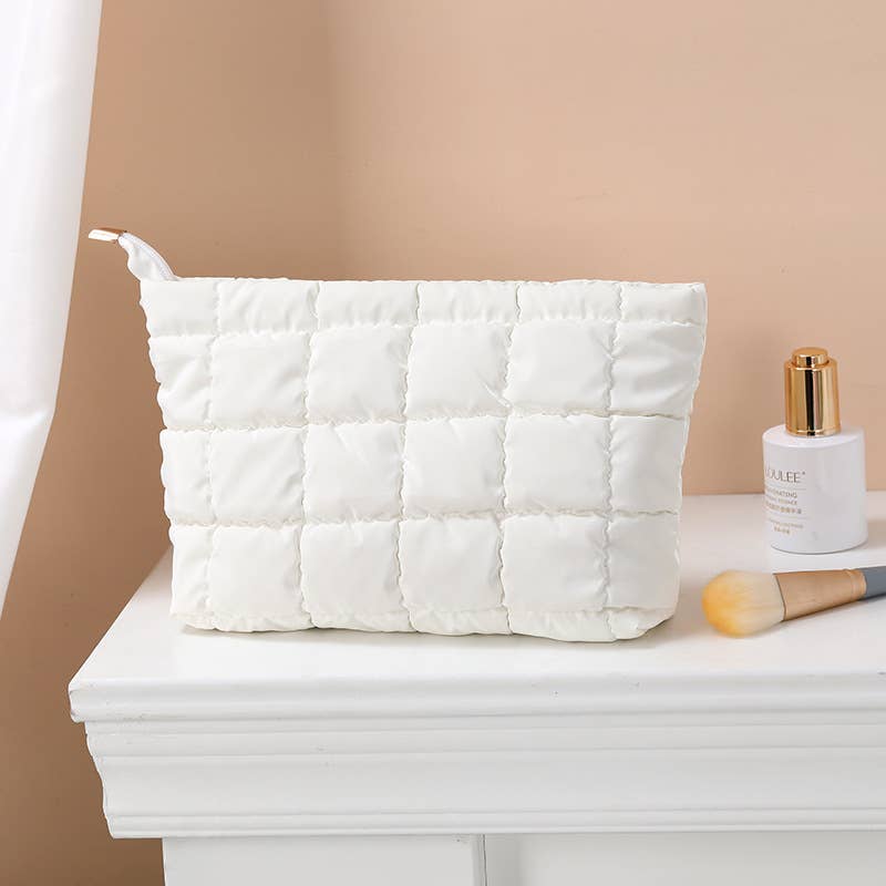 Showcases a charming color with a trendy quilted texture, giving it a stylish and cute appearance that's perfect for those who love fashionable accessories. Providing enough space for makeup, toiletries, or small essentials while remaining compact for easy carrying. Made from durable fabric with a soft, plush feel, ensuring longevity and a touch of luxury. The zipper closure keeps items secure. Ideal for travel, daily use, or as a gift. It keeps beauty items organized and easily accessible, blending fashion with functionality.